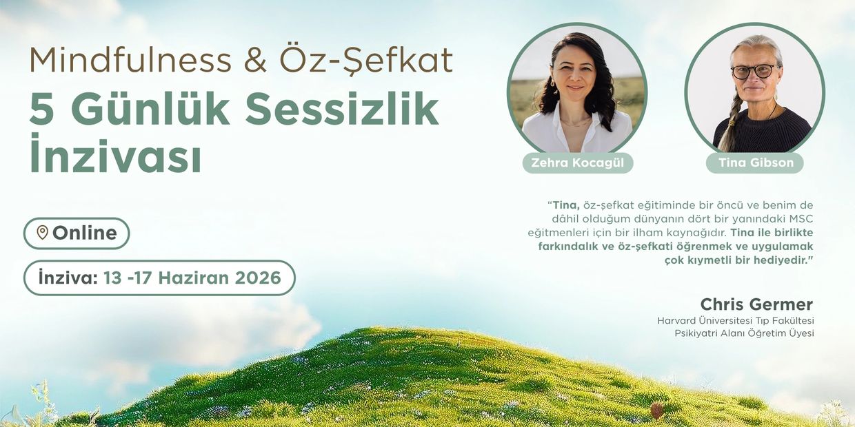 Sizi, kendi evinizin konforu ve güvenliği içinde sessizliği keşfedebileceğiniz bu online inzivaya davet ediyoruz. Uluslararası kabul görmüş standartlara uygun olarak gerçekleştirilecek olan inziva, Sertifikalı Öz-Şefkatli Farkındalık (MSC) eğitmenleri Tina Gibson ve Zehra Kocagül tarafından online olarak yürütülecektir.